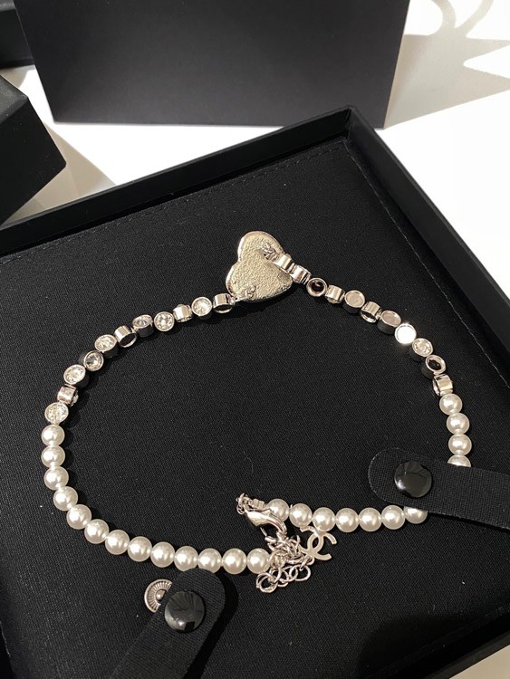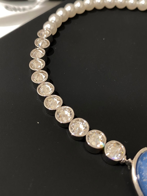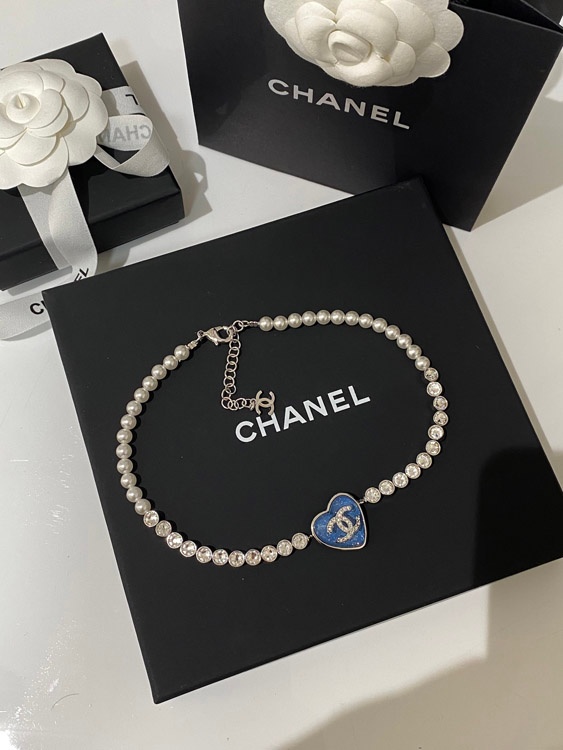 Chanel blue heart pearl rhinestone necklace-3594